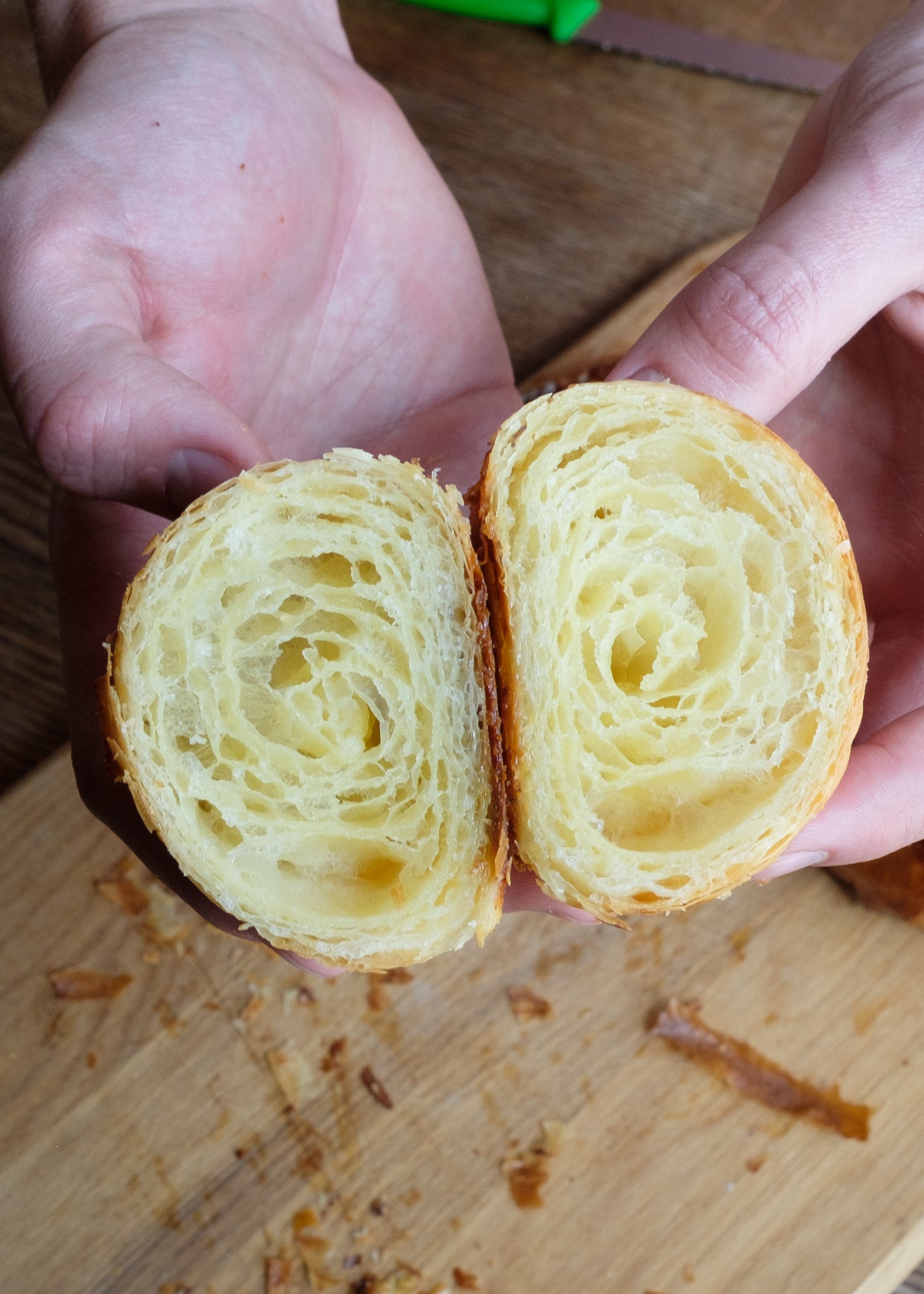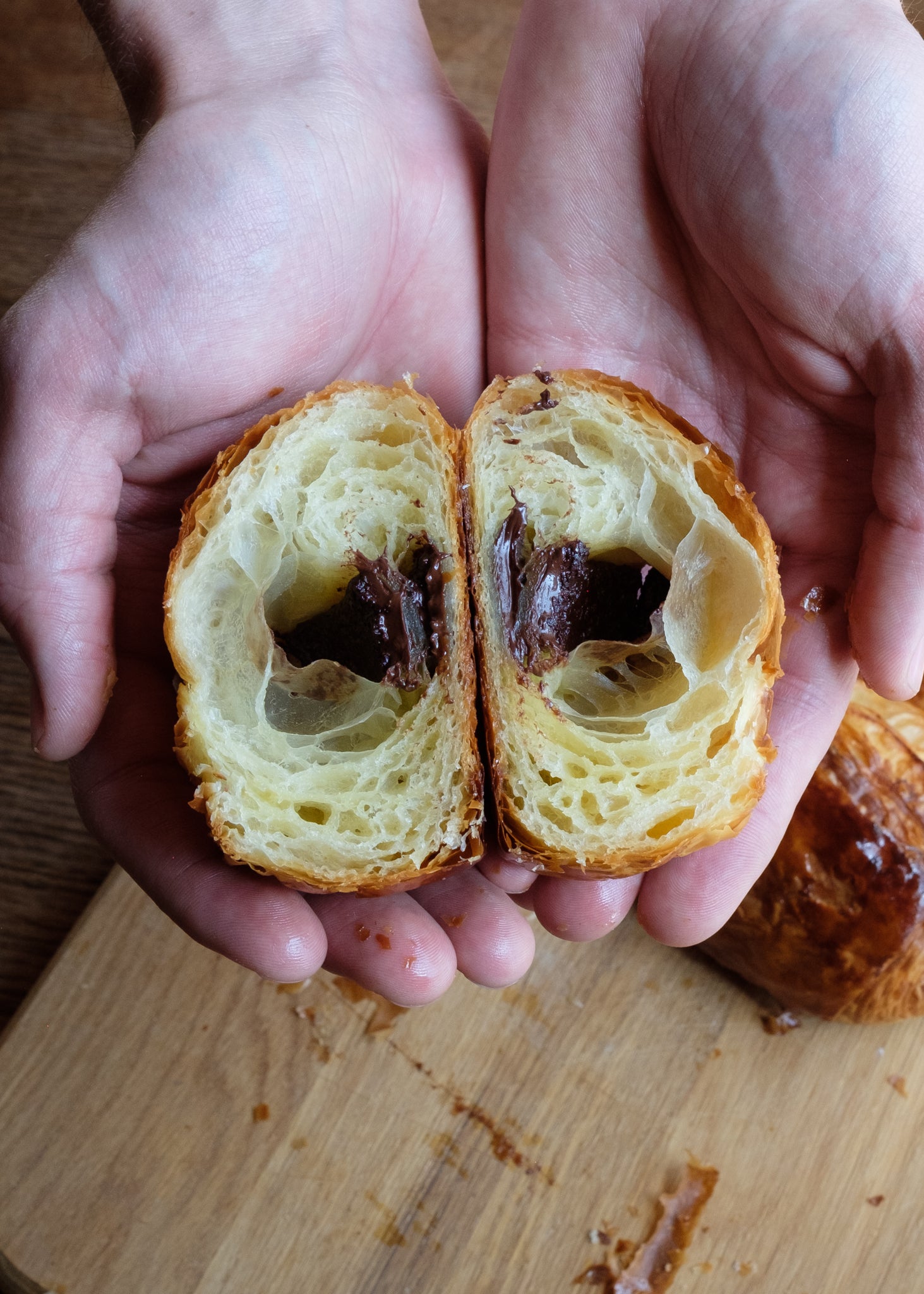 Croissant Ingredients: High Gluten Wheat Flour, Butter, Milk, Sugar, Salt, Yeast, Cocoa mass, Cocoa Butter, Soy Lecithin, and Natural Vanilla Flavoring