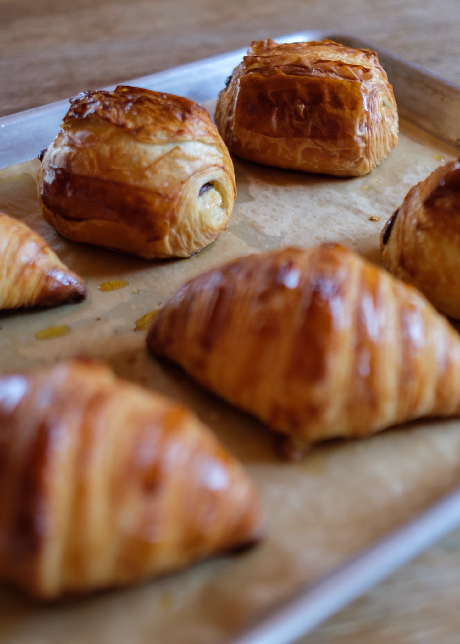 Buttery, flaky croissants and rich, sweet Sourdough Chocolate Chip Cookies, ready to be baked in your oven.