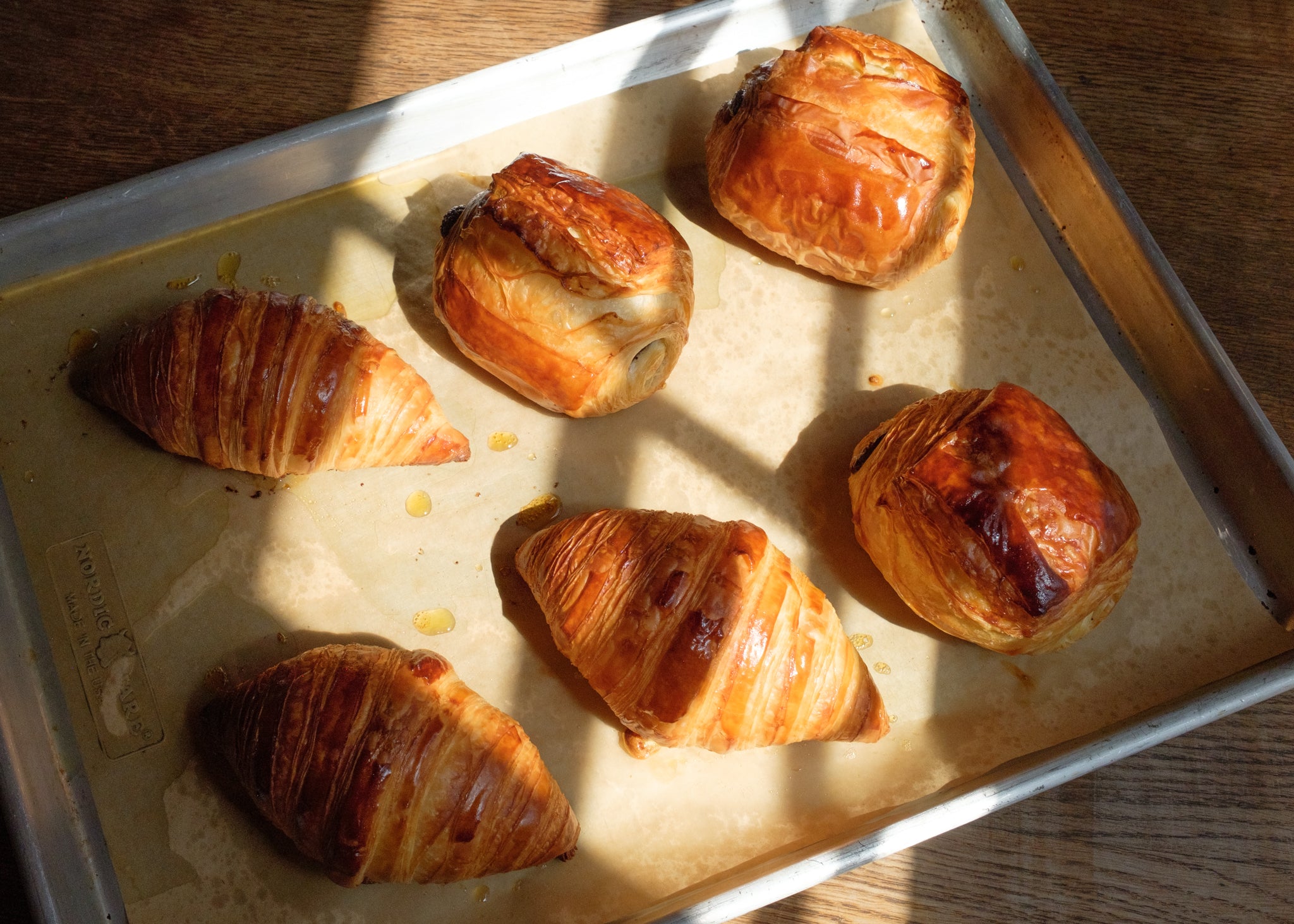 Buttery, flaky croissants and rich, sweet Sourdough Chocolate Chip Cookies, ready to be baked in your oven.