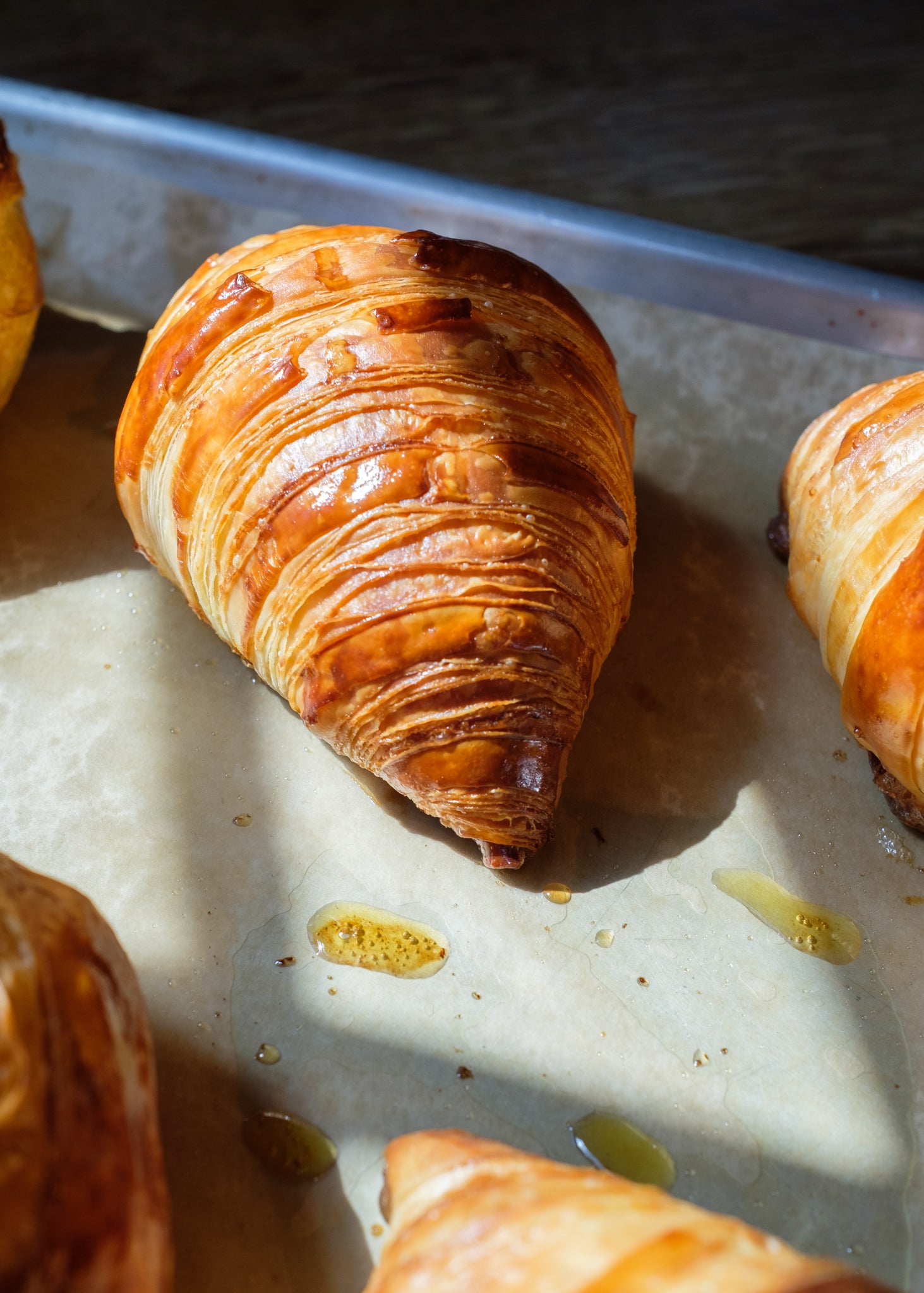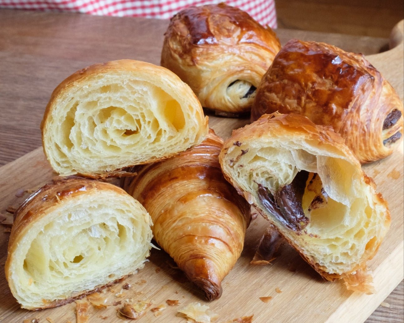 Croissant Ingredients: High Gluten Wheat Flour, Butter, Milk, Sugar, Salt, Yeast, Cocoa mass, Cocoa Butter, Soy Lecithin, and Natural Vanilla Flavoring