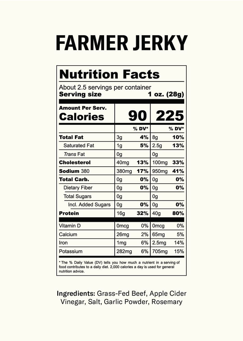 We start with 100% grass-fed beef, slice it thin, and season it simply with garlic, rosemary, and mineral-rich French salt. Then we let time do the rest. Each bag has 40g of protein and just five ingredients.