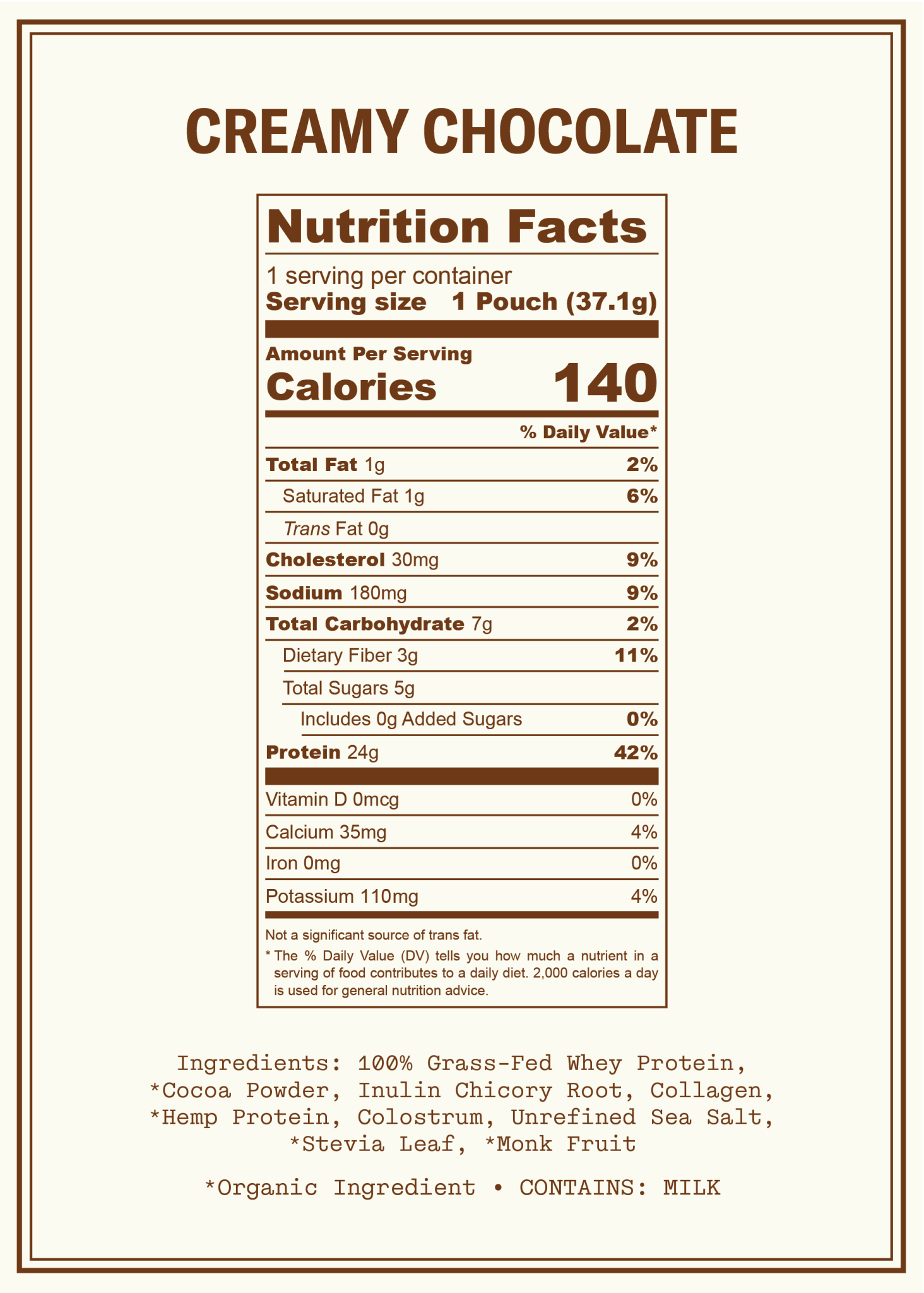 100% Grass-Fed Whey Protein, *Cocoa Powder, Inulin Chicory Root, Collagen, *Hemp Protein, Colostrum, Unrefined Sea Salt, *Stevia Leaf, *Monk Fruit | Contains Milk