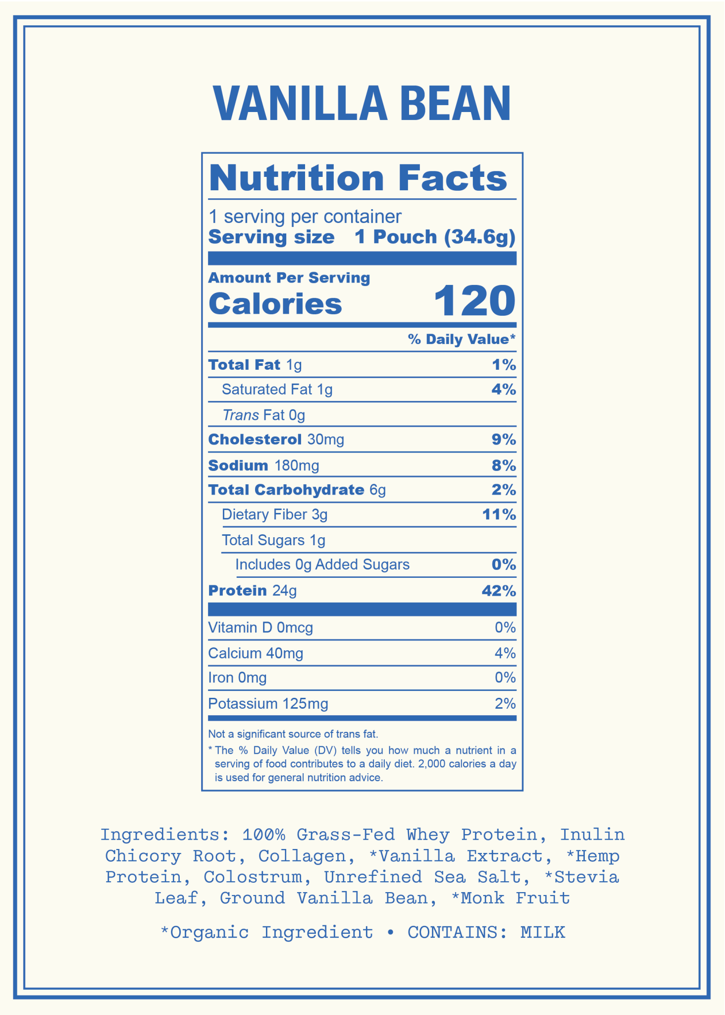 100% Grass-Fed Whey Protein, Inulin Chicory Root, Collagen, *Vanilla Extract, *Hemp Protein, Colostrum, Unrefined Sea Salt, *Stevia Leaf, Ground Vanilla Bean, *Monk Fruit