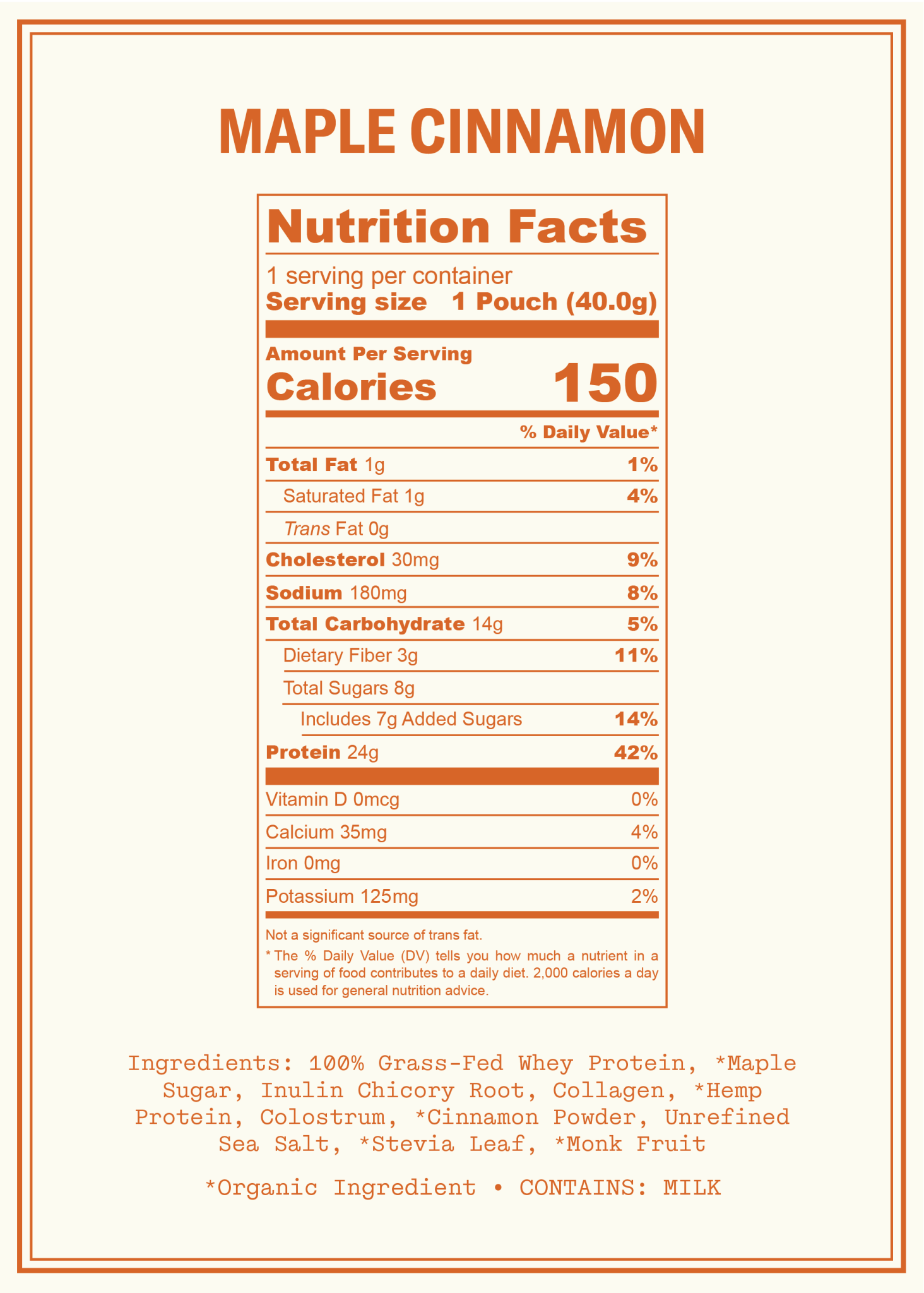 100% Grass-Fed Whey Protein, Maple Sugar, Inulin Chicory Root, Collagen, *Hemp Protein, Colostrum, *Cinnamon Powder, Unrefined Sea Salt, *Stevia Leaf, *Monk Fruit | Contains Milk