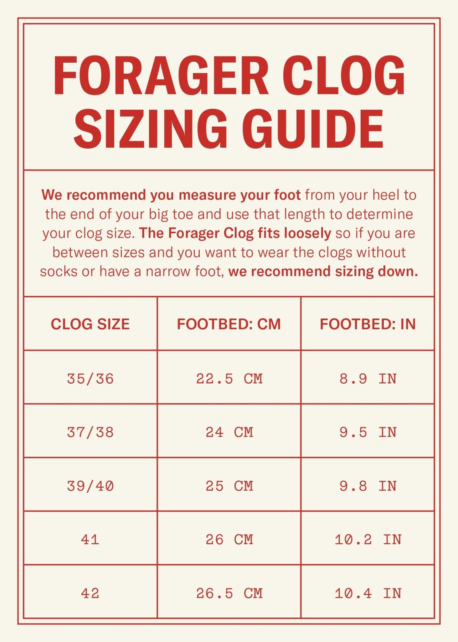 The Forager Clogs do not use standard US or European sizing. Please carefully consult the size guide found in the photo carousel before selecting your size. Designed to be worn loosely, we recommend sizing down if you plan to wear them barefoot or with thin socks. If you like your shoes large, take your regular size. If you are unsure or between sizes, we recommend sizing down.