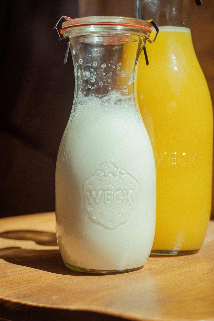 Our Juice Weck Jar Set takes the classic Weck jar design we love and reshapes it for pouring. With a tall, narrow silhouette, it’s perfect for holding 16 or 33 ounces of raw milk, fresh juice, kefir, or whatever you’re serving.